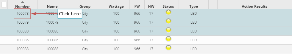 NOTE: The fixtures that are marked with a blue background are the ones that will be affected when sending commands. To perform this operation, click on the serial number of the fixture, in this way the row of the selected fixture will change to the blue background color.